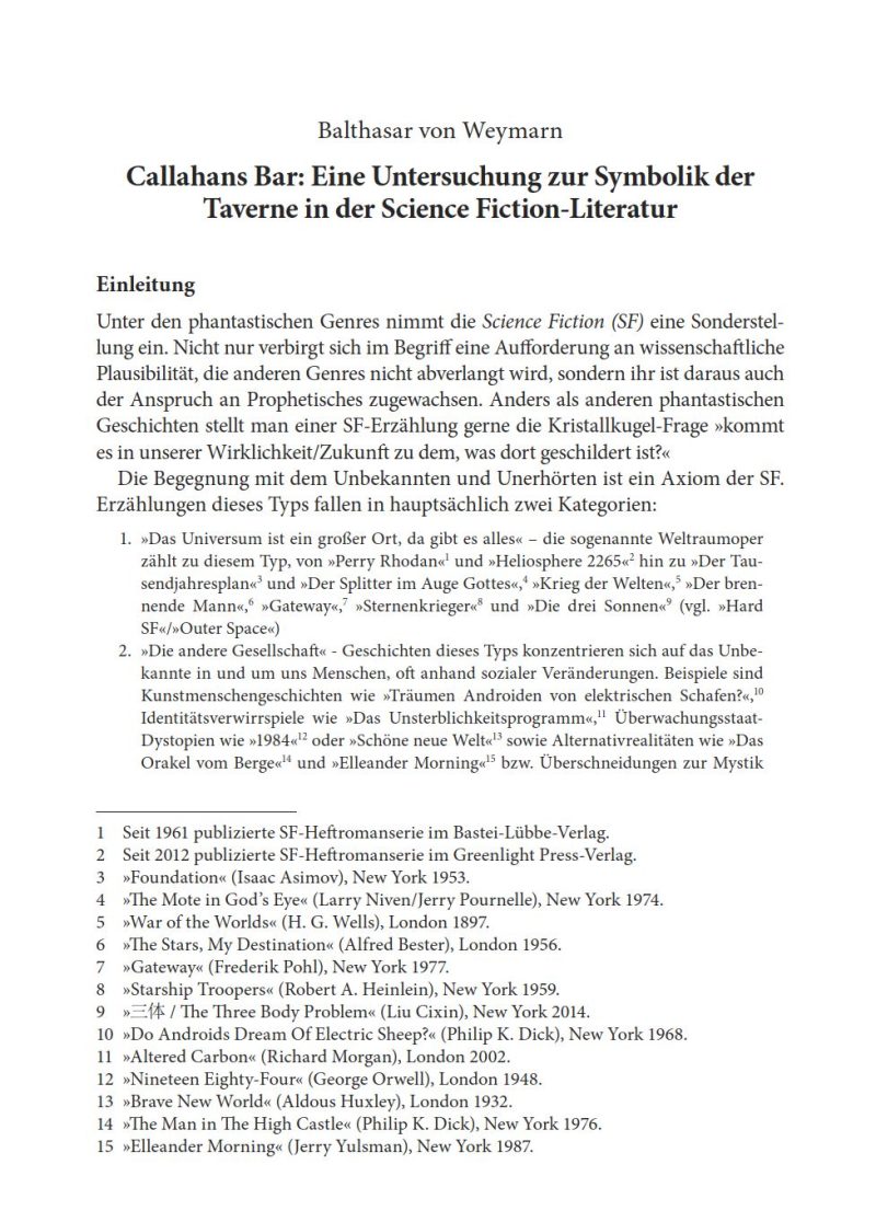 Tief in den Bereich der Science Fiction führt Balthasar von Weymarns Beitrag über Callahan’s Saloon. Man erfährt von den Symbolen des Verweilens in Callahans Bar: von der Schwelle, der Zigarrenkiste mit den Münzen und dem Kamin, in dem die zerschmetterten Trinkgläser als Opfergaben landen. Es sind erstaunliche Bräuche und Riten, die den Leser in ihren Bann ziehen. Es ist dem Autor wichtig, auf jene Elemente – seien es Sprachen, seien es Bilder – hinzuweisen, die in ihrem Symbolgehalt auf tiefere Bedeutungsebenen hindeuten (aus dem Klappentext)